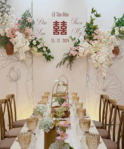 - Trang trí phong màn voan + Fomr hoa lụa + chữ hỷ